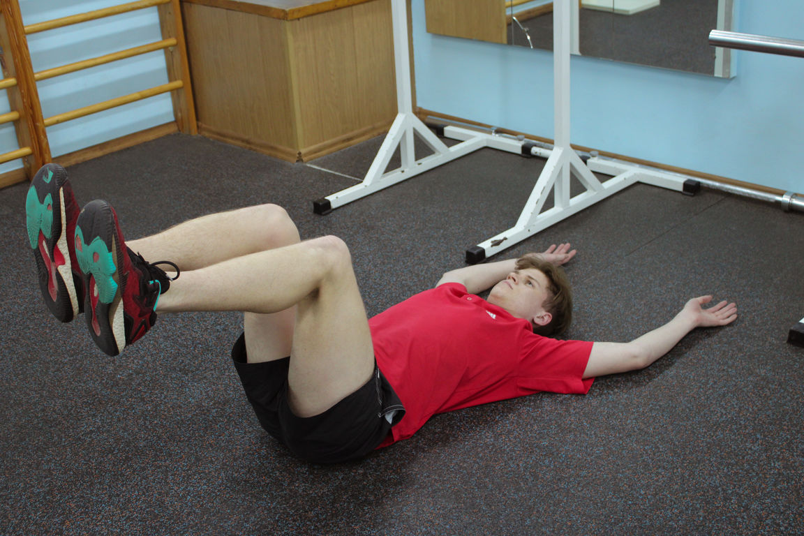• Исходное положение, ноги согнуты под 90 градусов, прямые руки лежат на полу.