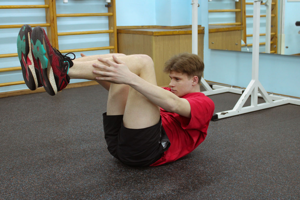 • Мощным движением тянемся руками к голеням, не отрывая поясницу.