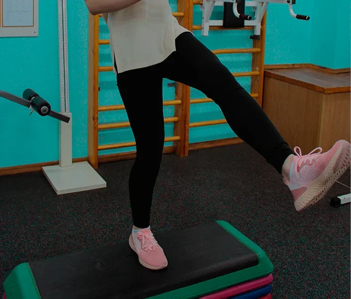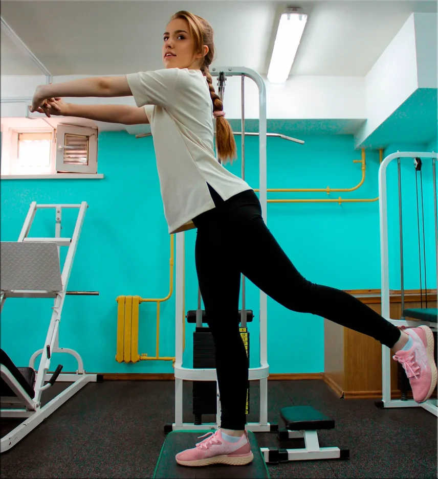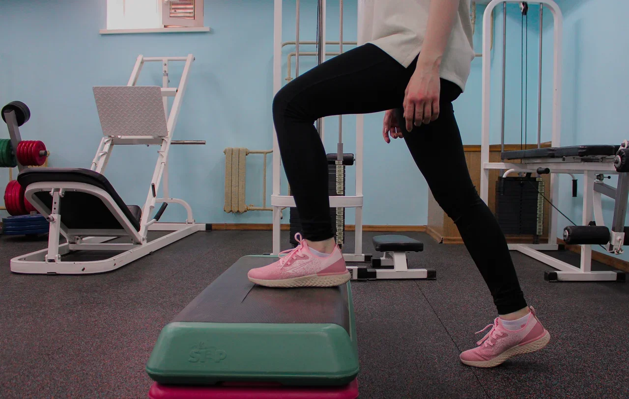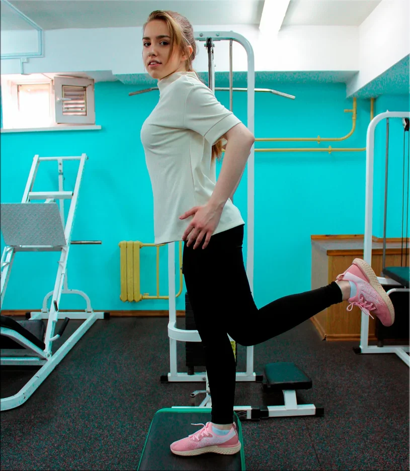Одна нога всегда стоит на месте (на платформе), и только вторая нога перемещается вперед-назад и становится на пол. Данное упражнение улучшает работу дыхательной системы, развивает координацию, укрепляет мышцы.